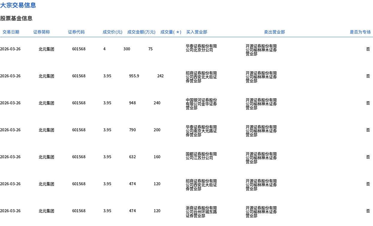 3月26日,北元集团大宗交易成交1267万股,成交额5008.4万元,占当日总成交额的20.3%,成交均价3.95元,较市场收盘价4.28元折价7.64%,其中最高成交价4元,最低成交价3.95元。
