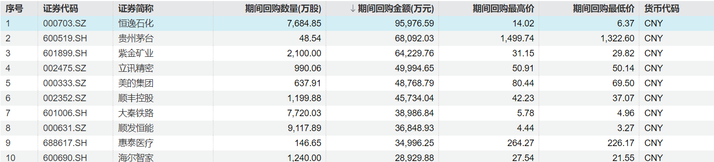 近期,回购金额最高的企业包括恒逸石化(000703.SZ)(期间回购金额9.6亿元)、贵州茅台(600519.SH)(期间回购金额6.81亿元)、紫金矿业(601899.SH)(期间回购金额6.42亿元)等。部分公司在近期也披露了大额回购计划,海尔智家在大手笔派现的同时拟回购30亿-60亿元用于员工持股计划,新披露的回购计划总金额也均超15亿元。