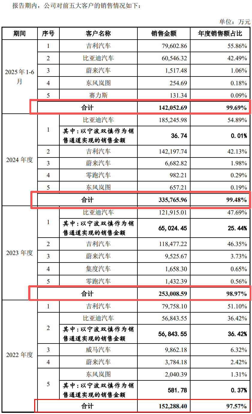 在业绩增长背后,公司客户集中度极高,几乎全部收入来自前五大客户,对比亚迪、吉利尤为依赖。