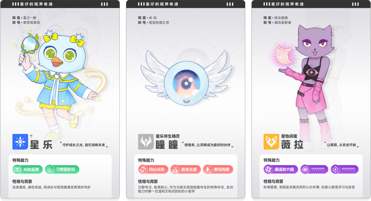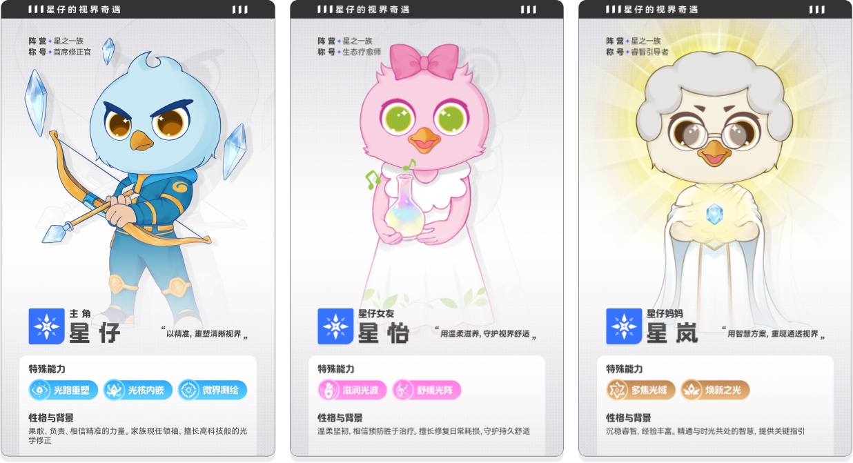据创作团队负责人包主任介绍,故事主线围绕星辉眼科IP形象“星仔”在人类视界的冒险展开。创作团队巧妙地将抽象的病理机制转化为具象的奇幻设定:当人类因长期不良用眼产生“视觉阴霾”时,负能量会撕裂时空打开“暗影裂隙”,滋生以破坏清晰视觉为乐的“眼病邪灵”。为了驱散阴霾,来自光之世界的守护者家族——“星之家族”(包括星仔、女友星怡、母亲星岚、弟弟星乐,以及伴生精灵瞳瞳和闺蜜薇拉等)携手穿越裂隙,帮助人们重现清晰世界。而为了让这些守护者形象更加鲜活立体,更好地承载这一宏大世界观,视觉设计也迎来了同步升级。