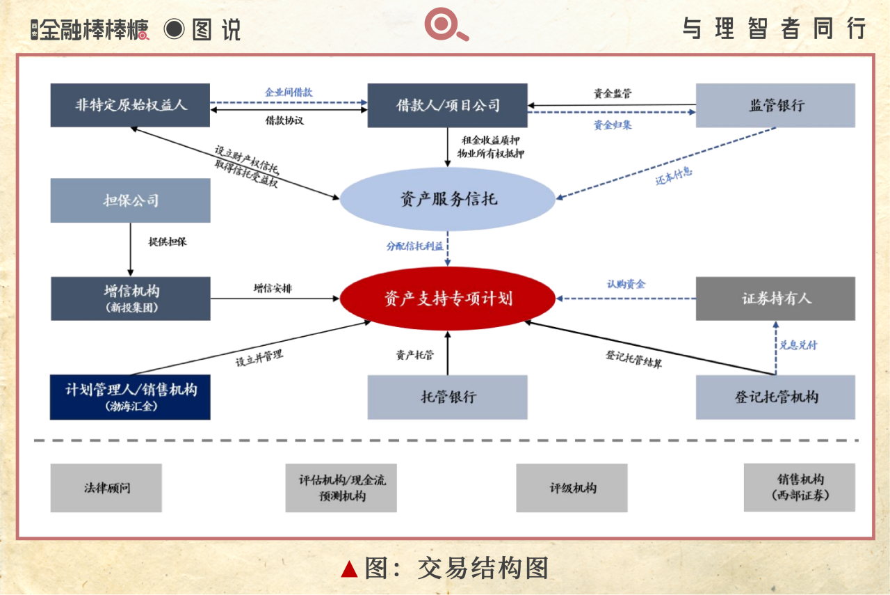 该项目原始权益人为延安新区投资发展(集团)有限公司(下称新投集团),隶属于延安市国资委。项目公司/借款人为延安新投建设,受托人为陕国投,渤海汇金证券资管公司担任计划管理人。标的物业为延安能源大厦项目,优先级产品1.45亿元获AAA评级。