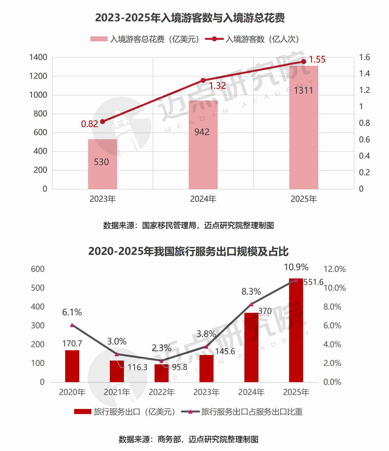 技术赋能加速、文旅融合深化、政策红利扩大等多重利好因素叠加,国内旅游市场规模实现历史性突破,旅游人次(65.22亿人次)和旅游总花费(6.3万亿元)均创新高,旅游业稳步迈入高质量发展新阶段;入境旅游强势增长,全年入境游客1.54亿人次、入境游客总花费1311亿美元、旅行服务出口规模升至551.6亿美元,入境旅游成为推动中国服务贸易升级与经济增长的重要引擎。