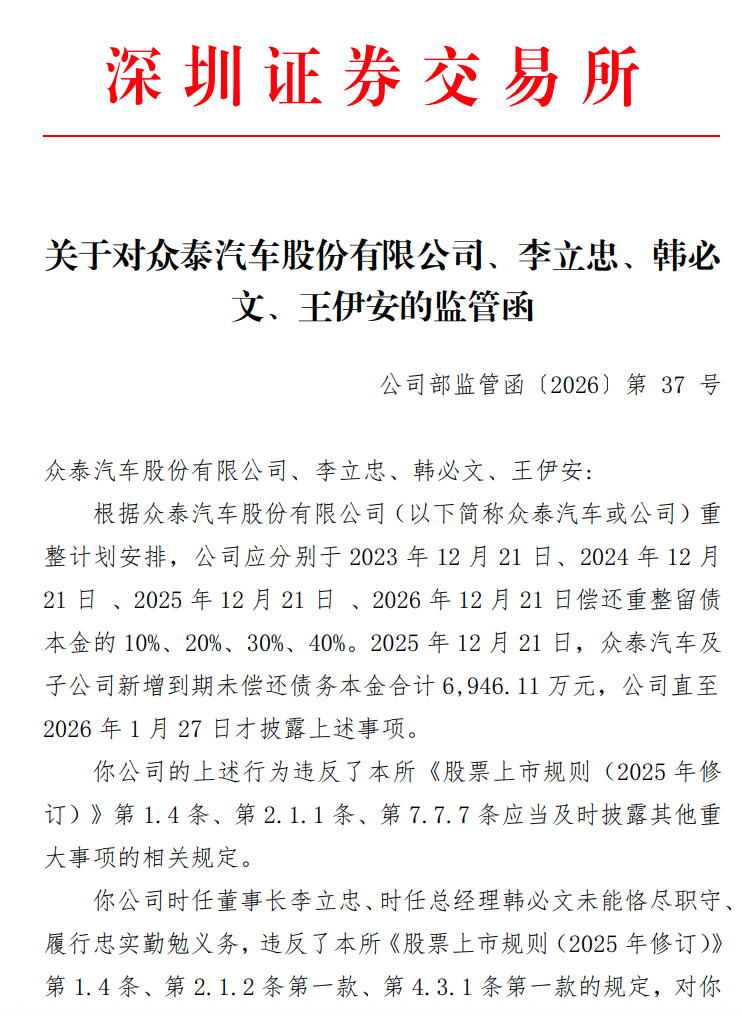 3月27日,深交所向众泰汽车(000980.SZ)下发一则监管函。监管函显示,根据众泰汽车重整计划安排,公司应分别于2023年12月21日、2024年12月21 日 、2025年12月21日 、2026年12月21日偿还重整留债本金的10%、20%、30%、40%。2025年12月21日,众泰汽车及子公司新增到期未偿还债务本金合计6946.11万元,公司直至2026年1月27日才披露上述事项。