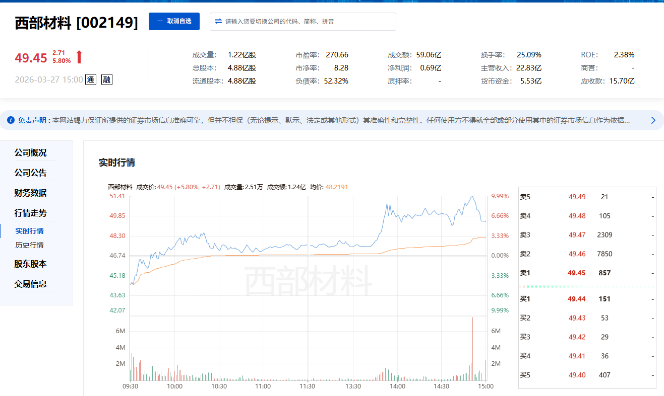 在陕西板块 58 只上涨个股中,西部材料涨幅第一,显著跑赢板块平均(+0.7%),成为当日区域市场最亮眼标的。