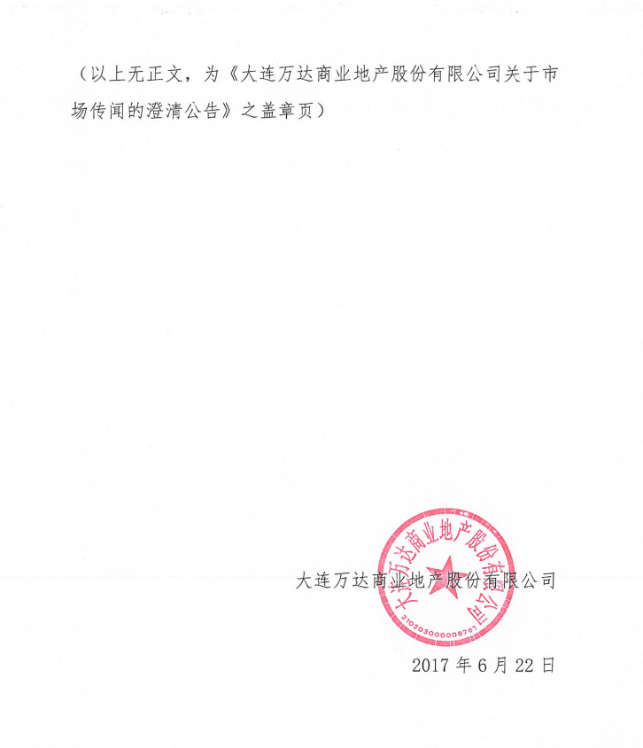 6月22日,网络媒体出现“建行等银行下发通知抛售万达债券”相关传闻,造成公司债券价格出现较大波动,万达商业地产发布澄清公告称,目前公司财务状况良好,日常运营一切正常,现金流充裕,无任何偿债风险。