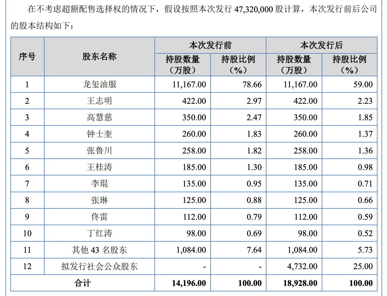 根据披露,胜利龙玺(山东)石油工程技术服务股份公司(下称“龙玺油服”)直接持有祺龙海洋1.12亿股,占总股本78.66%,为绝对控股股东。其余股份由王志明、高慧慈等51名自然人股东直接持有,合计占比21.34%。