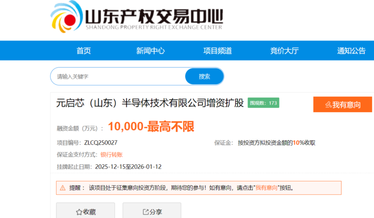 同年12月,元启芯增资扩股项目在山东产权交易中心挂牌,融资额不低于1亿元。挂牌底价为每股4.8元,拟募集资金对应持股比例为7.69%—20%,拟公开募集资金对应股份数(股)为2083.33万股—6250万股,拟新增注册资本2083.33万元—6250万元,拟征集投资方数量2—5个。