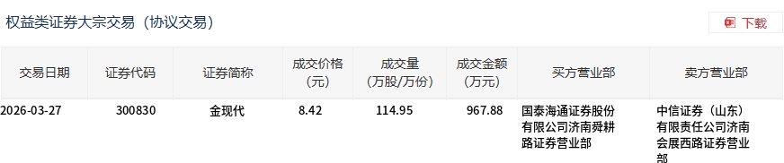 3月27日,金现代大宗交易成交114.95万股,成交额967.88万元,占当日总成交额的7.77%,成交价8.42元,较市场收盘价10.63元折价20.79%。