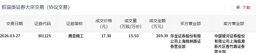 3月27日,腾亚精工大宗交易成交15.5万股,成交额269.39万元,占当日总成交额的6.9%,成交价17.38元,较市场收盘价19.31元折价9.99%。