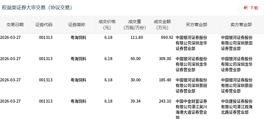 3月27日,粤海饲料大宗交易成交231.14万股,成交额1428.42万元,占当日总成交额的9.59%,成交价6.18元,较市场收盘价7.56元折价18.25%。
