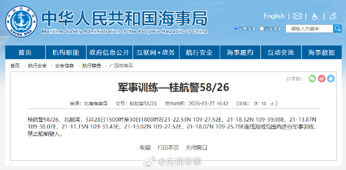 据中国海事局网站消息,北海海事局发布航行警告,3月28日15时至30日18时,北部湾部分海域进行军事训练,禁止船舶驶入。