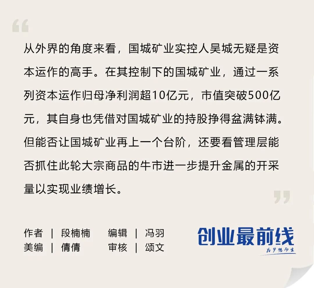 从外界的角度来看,国城矿业实控人吴城无疑是资本运作的高手。在其控制下的国城矿业,通过一系列资本运作归母净利润超10亿元,市值突破500亿元,其自身也凭借对国城矿业的持股挣得盆满钵满。但能否让国城矿业再上一个台阶,还要看管理层能否抓住此轮大宗商品的牛市进一步提升金属的开采量以实现业绩增长。
