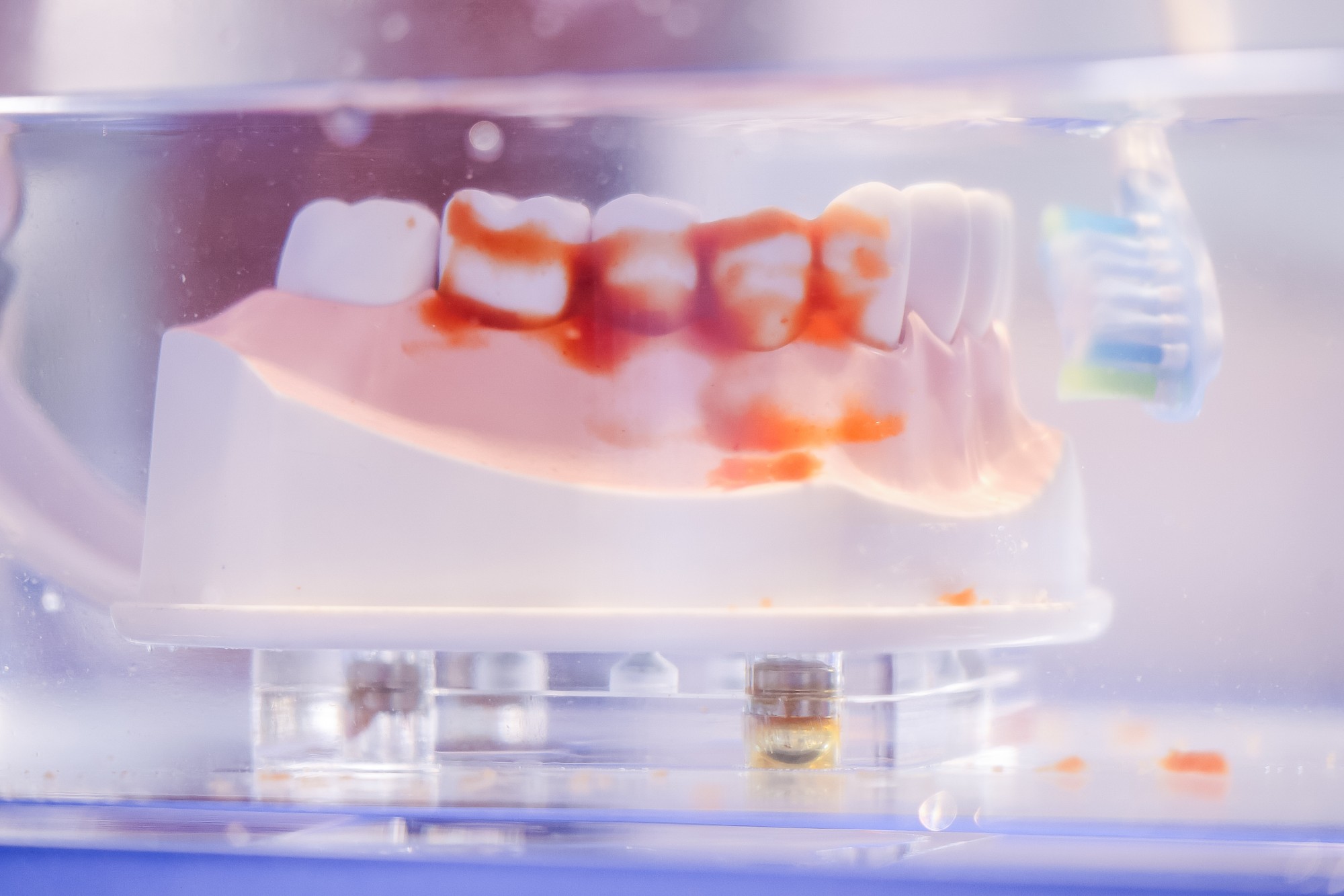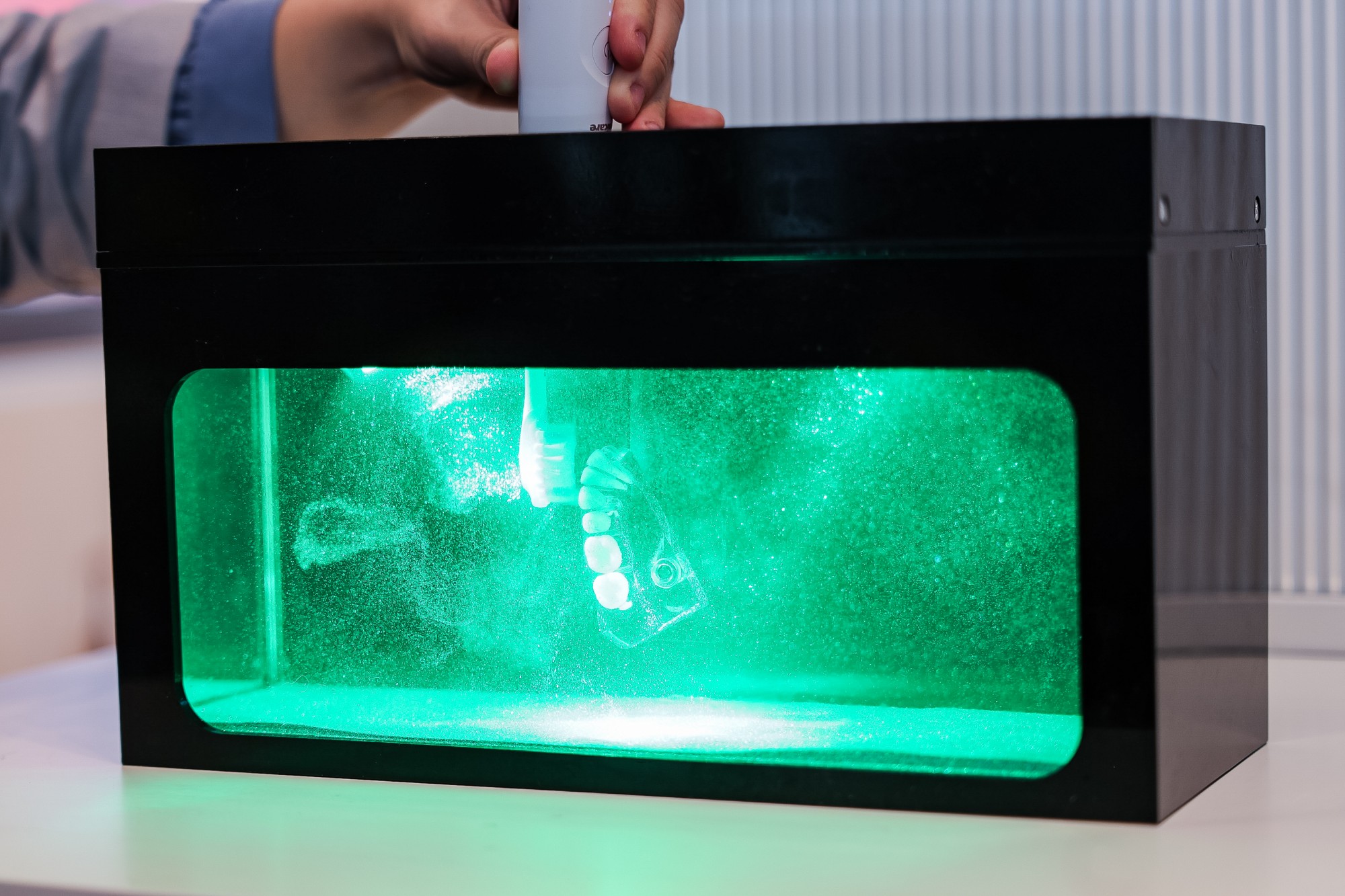 ·微泡水流实验:在装满激光油的实验装置中,可以清晰地看到在高频振动下飞利浦电动牙刷激发出大量的微泡水流,轻盈渗透、精准深入模拟齿缝的每一处死角,将隐匿污渍悄然带走,让那些日常刷牙难以触及的区域,也能实现温和高效清洁。这正是飞利浦「专业声波洁牙科技」所独具的清洁力。