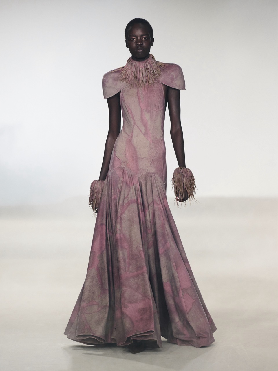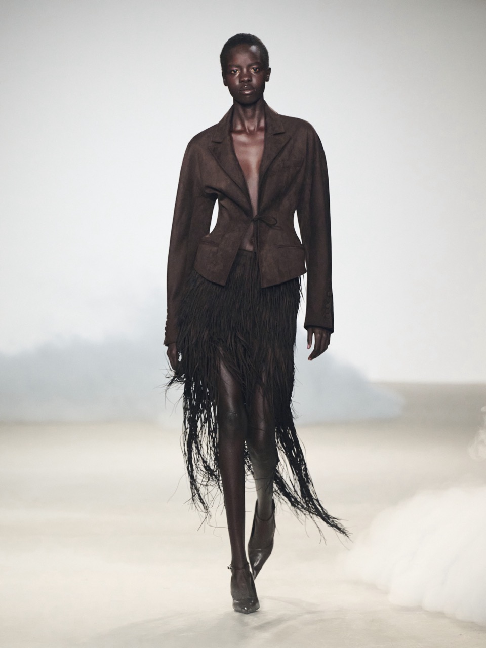 OUDE WAAG 2026秋冬系列以“激进温柔”为主题,从旧秩序断裂后的个体体验出发,在对抗与松弛之间寻找新的平衡。秀场在低沉悠扬音乐中展开,大地色系贯穿始终,环保麂皮被切割为流苏,取代尖锐结构,呈现出柔软却带有力量的身体表达。
