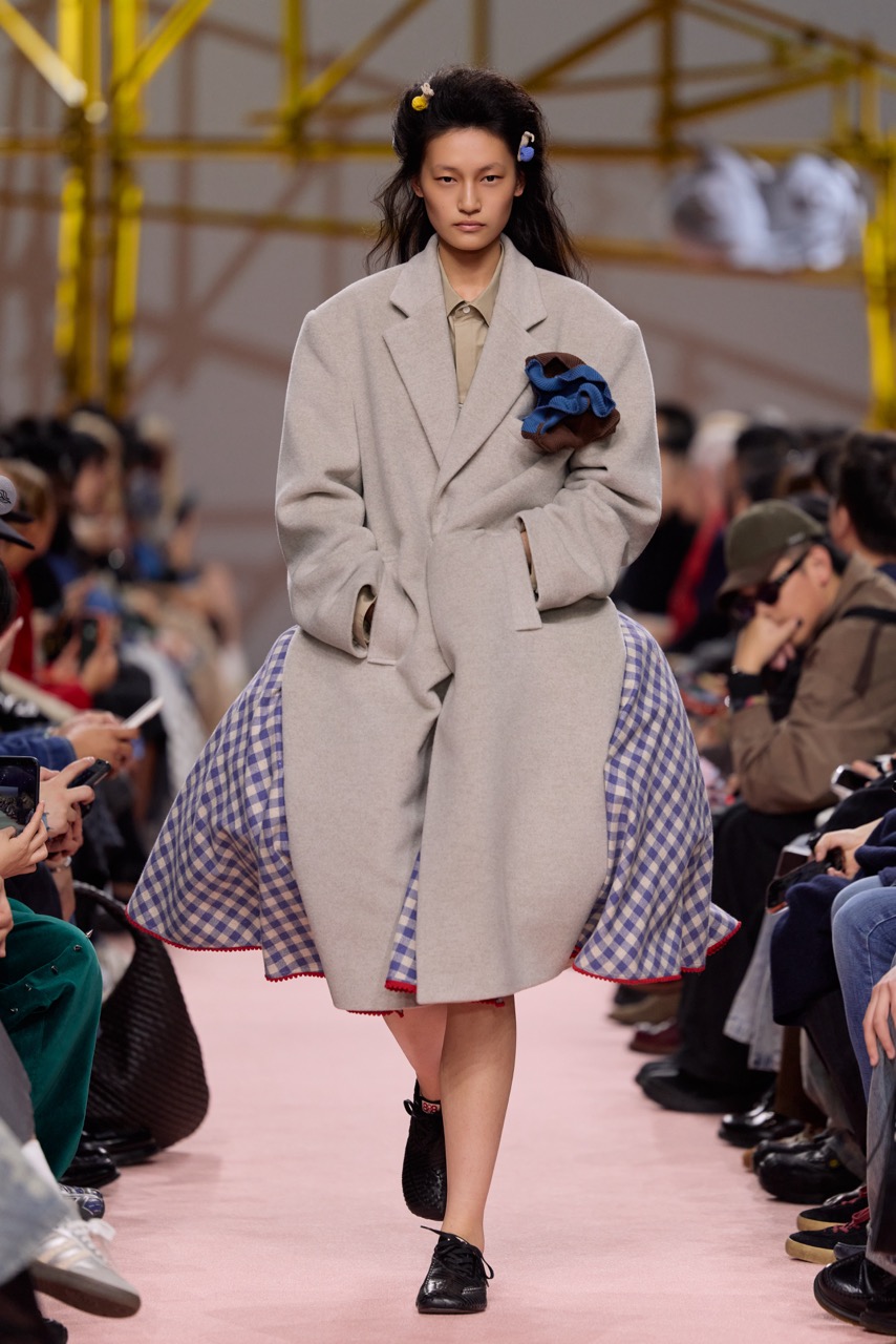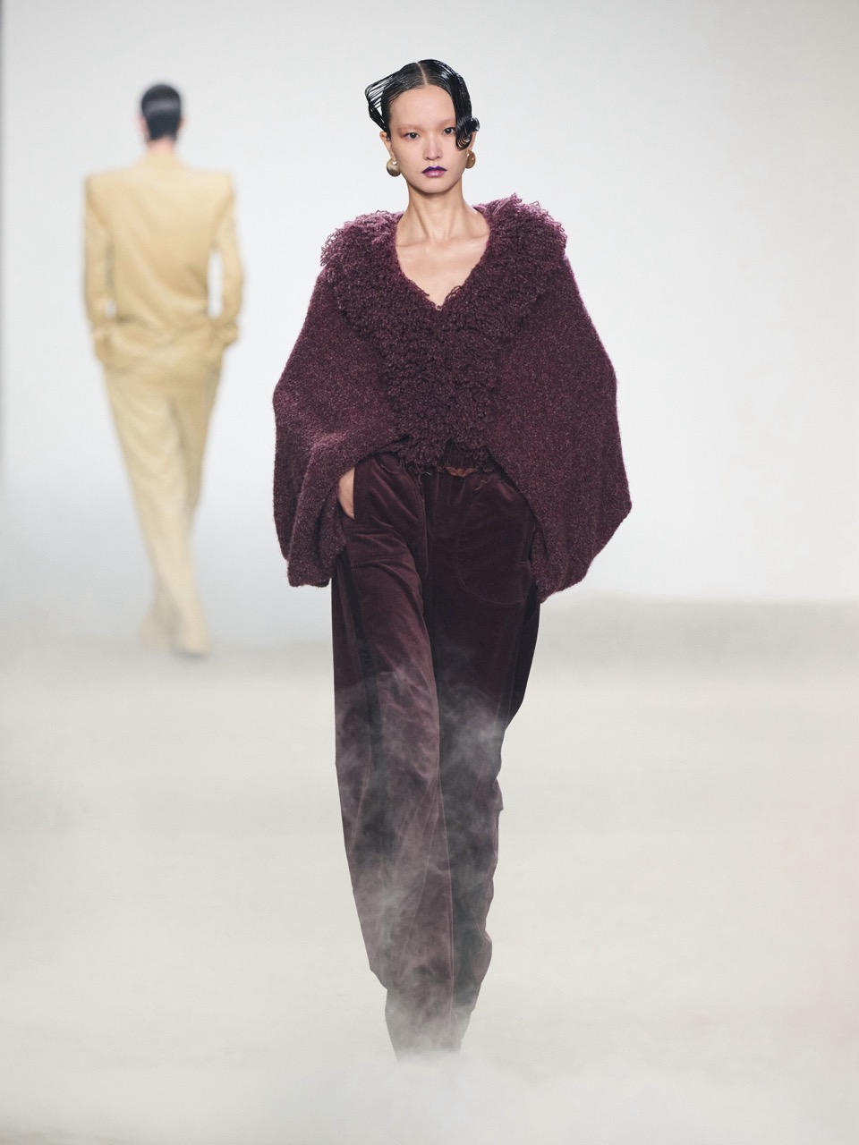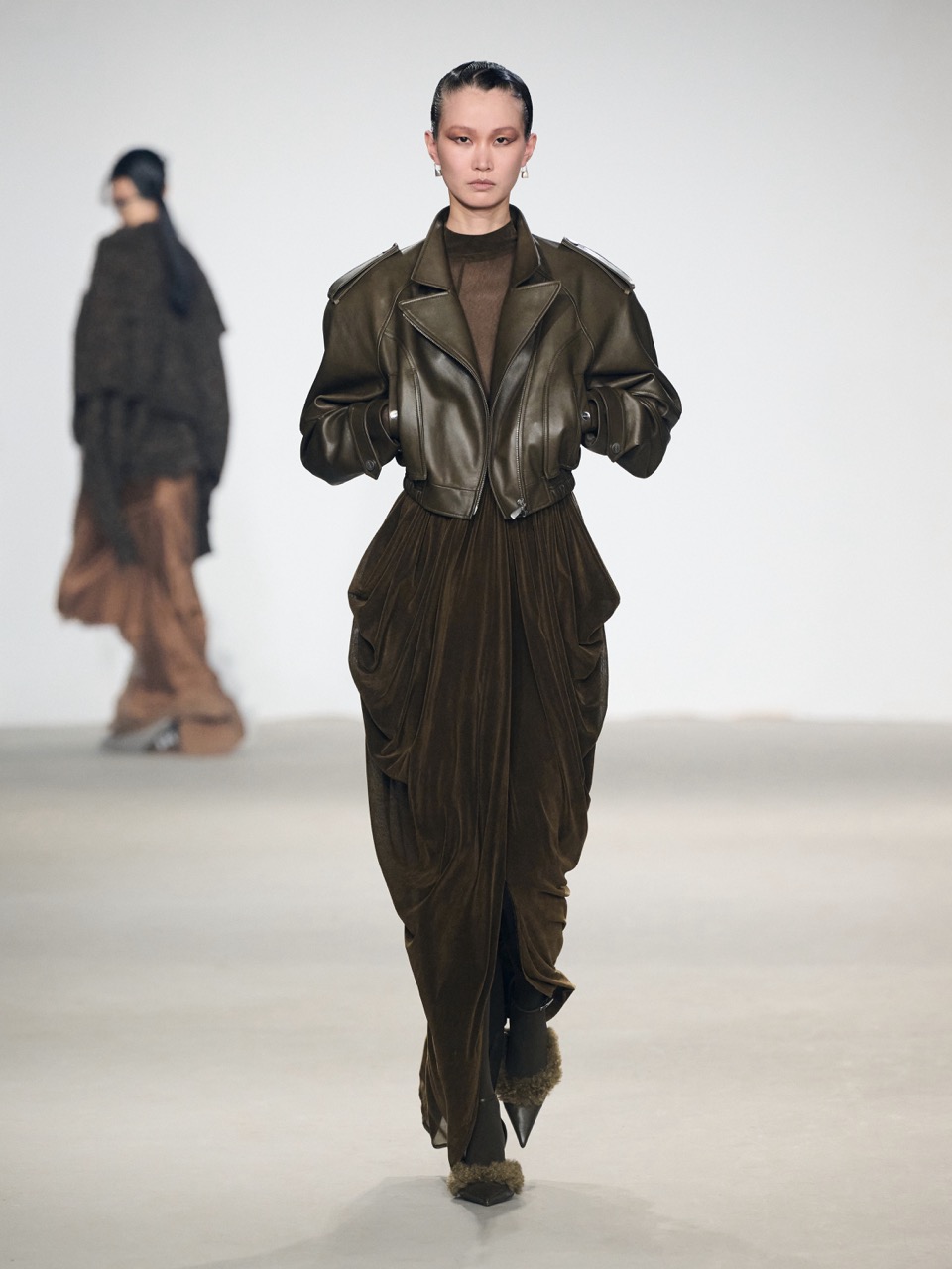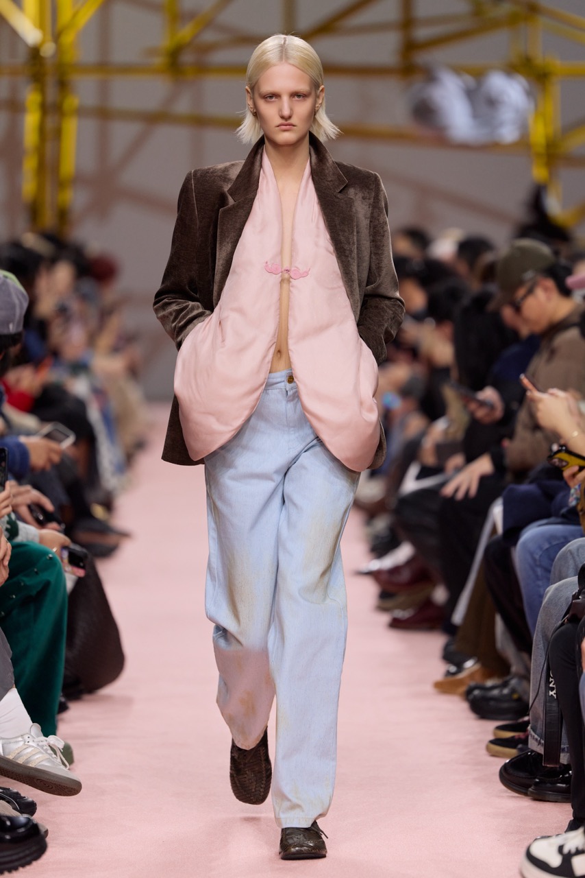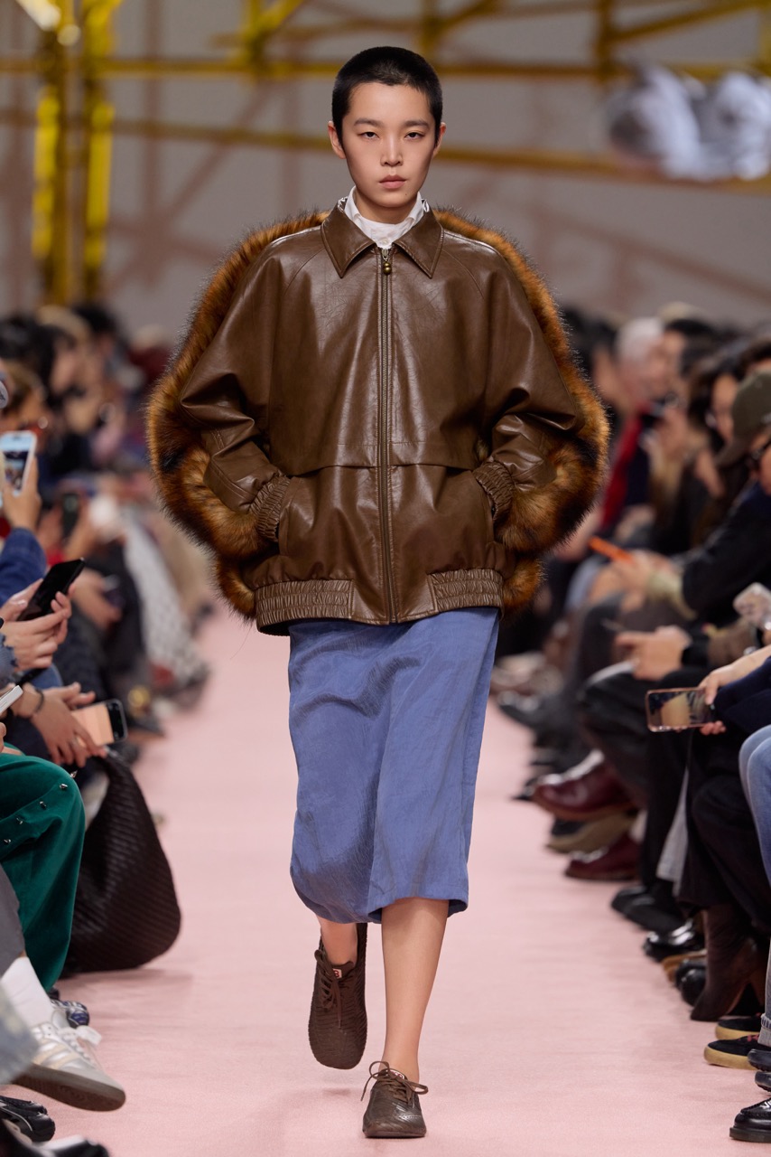 材质与廓形的对比成为本季重点:斜裁铜氨丝与真丝雪纺在行走中形成流动层次,与做旧涂层棉及皮毛一体夹克的硬朗结构形成张力;粗纺毛衫的破洞与浮线则隐约指向创伤痕迹。与此同时,弹力丝绒与灯芯绒重新演绎女性轮廓,男装元素被引入并转化为更具力量感的造型语言。