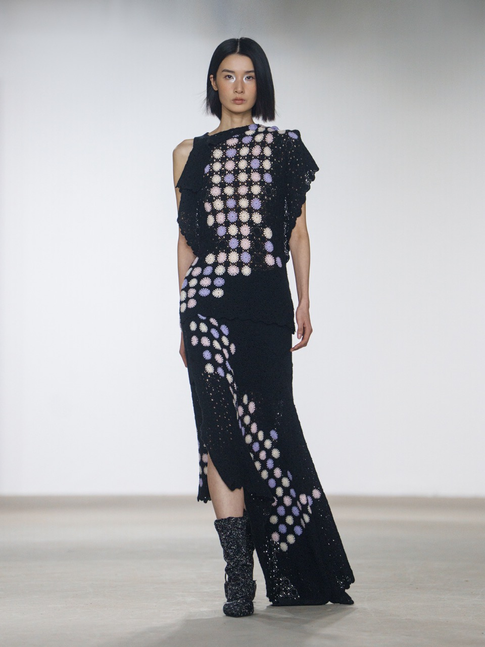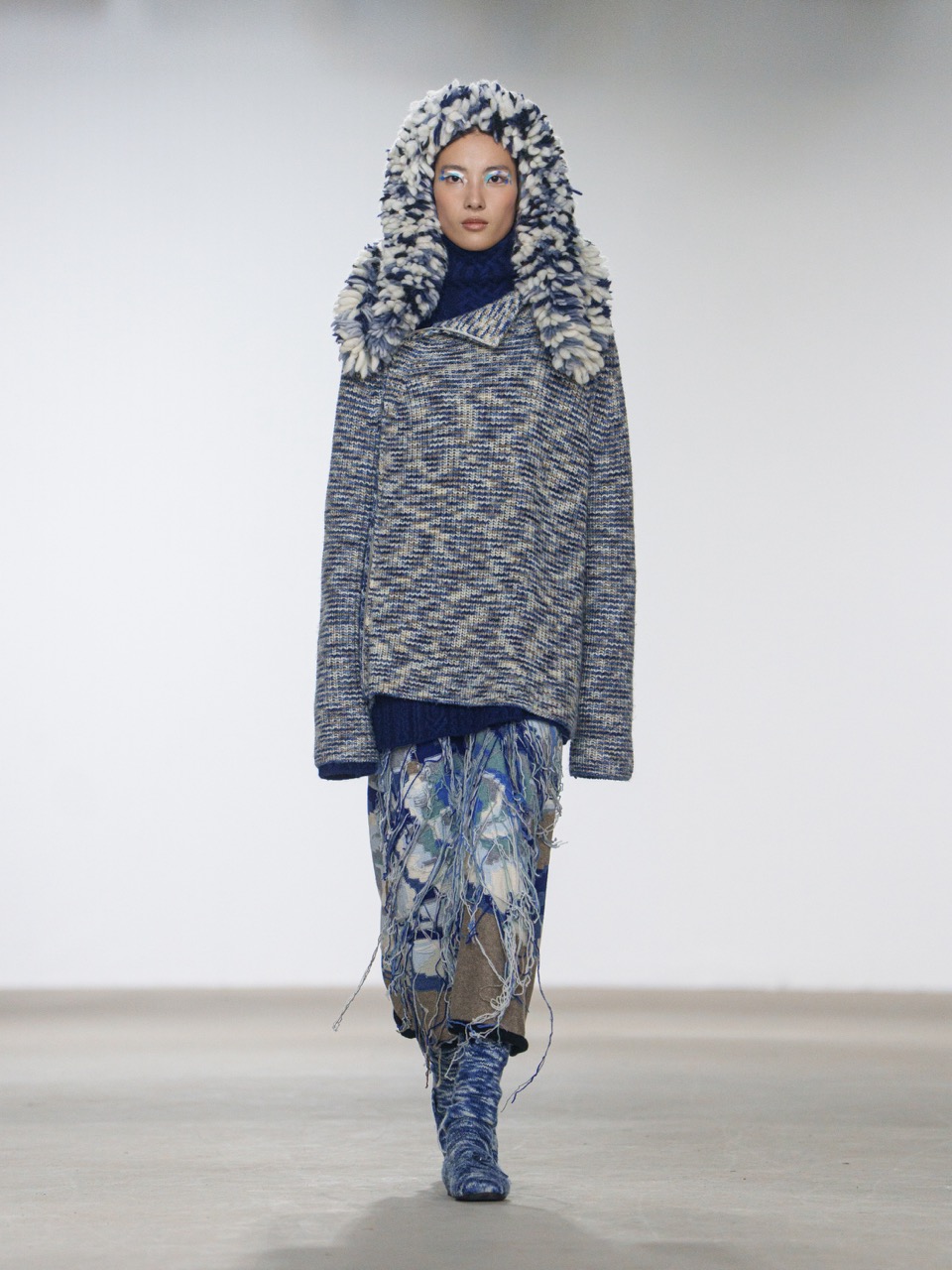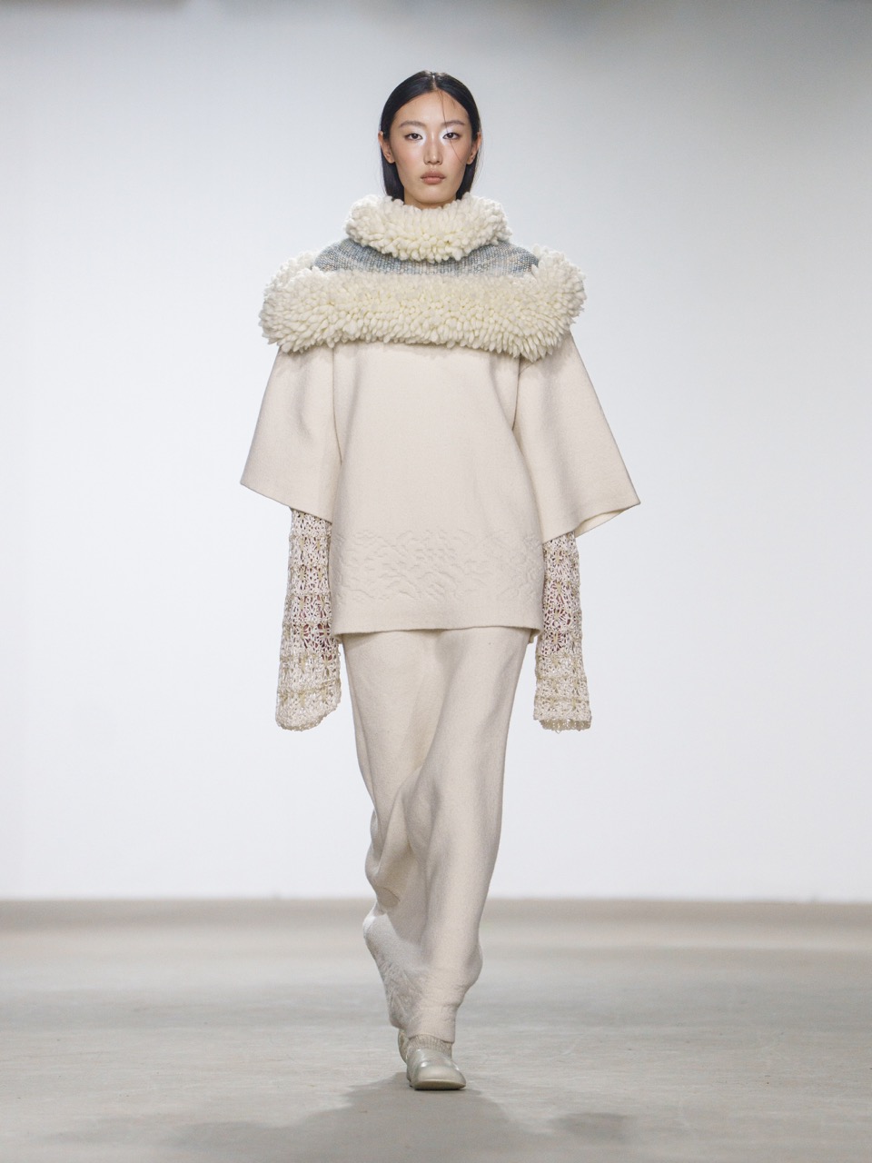 swaying/knit 2026秋冬系列以“框外之景”为主题,从“观看”与“被观看”的关系出发,将服装转化为一种可穿戴的取景装置。针织材质的柔软与廓形结构形成对照,镂空提花让肌肤成为流动景观,肩线则在宽松轮廓中建立边界,使身体在束缚与自由之间游走。
