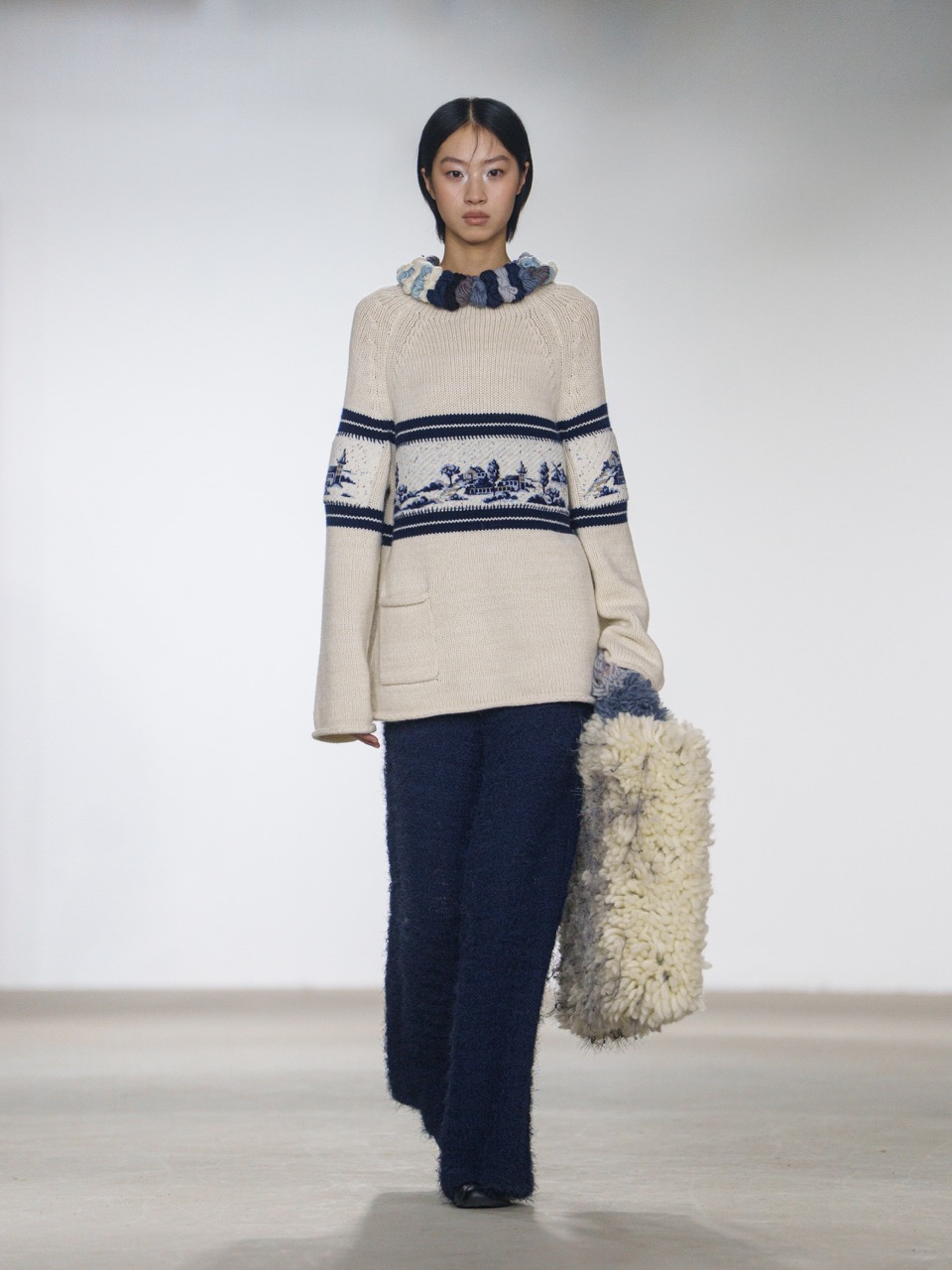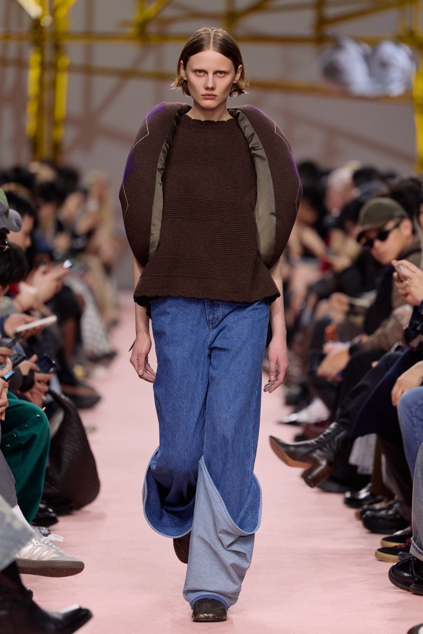 本季在材质与图像语言上展开多重叠加。像素化山峦与双重曝光的绞花纹理共同构成视觉层次,马海毛、丝光棉与粗纺纱在对比中形成触感张力;羊绒与尼龙的拼接,则进一步强化厚重与轻盈的交替关系。色彩从黑白过渡至更为鲜明的表达,呈现出边界被不断打破的过程。