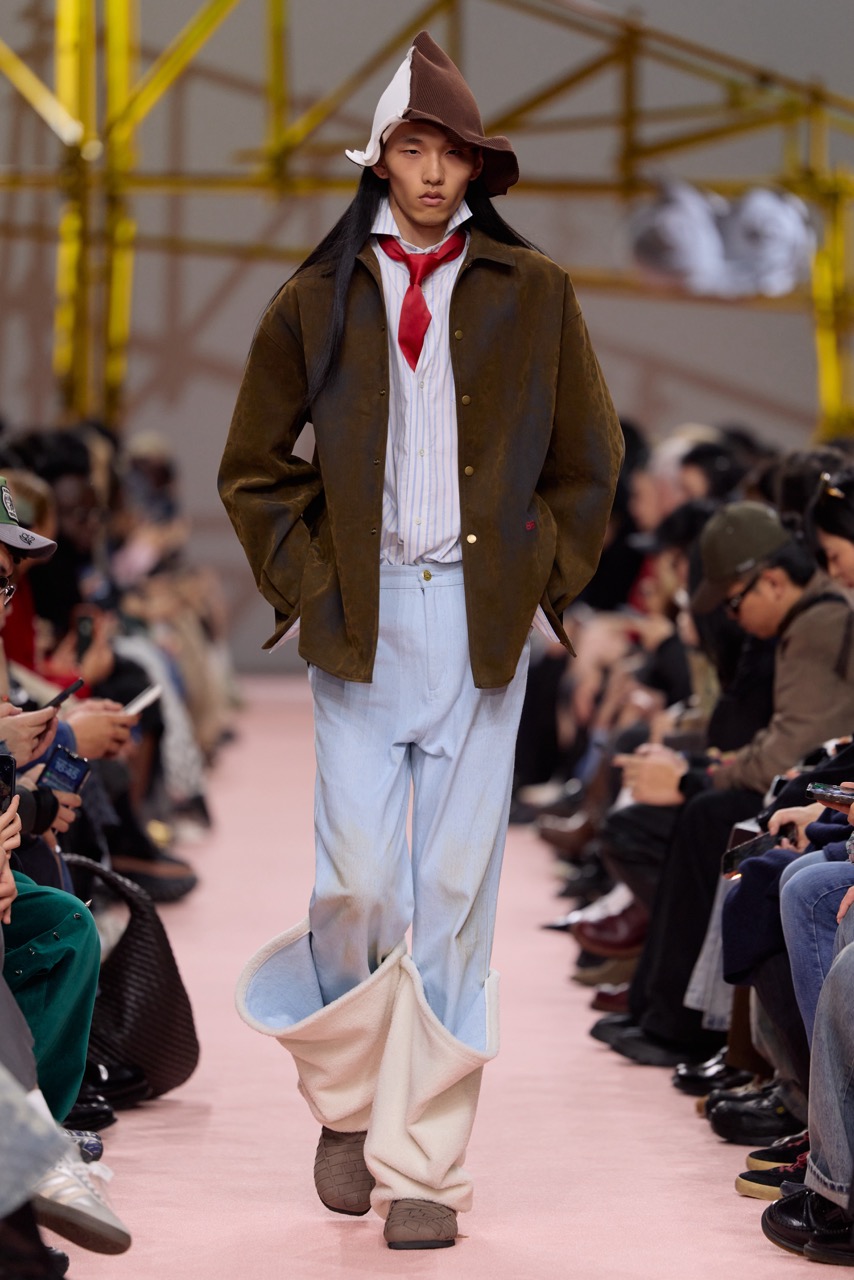 8ON8本季以“双相之躯,共壳为生”为核心意象,在现实与幻想交错的叙事中展开。设计师龚力以“西部荒野”为视觉母题,引入旅人形象,将粗粝与精致并置,构建出游离于都市与想象空间之间的时装语境。