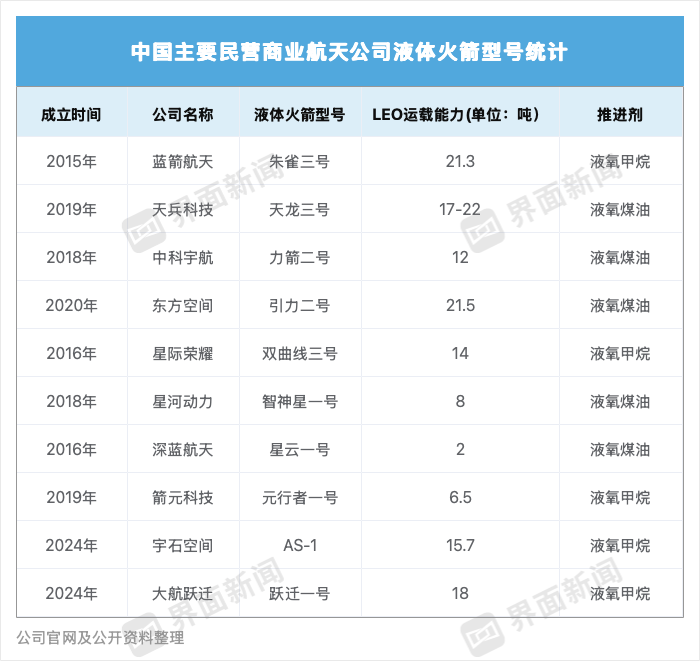 在此之前,中国民营商业航天领域成功发射入轨的液体火箭型号仅有四款,分别为天兵科技的天龙二号、蓝箭航天的朱雀二号、朱雀二号改进型和朱雀三号。但各家中国商业火箭公司都在积极布局液体火箭。