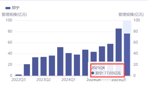 同花顺iFinD显示,截至2025年末,中银基金权益产品(包含混合型、股票型)总规模约为304亿元,而郑宁一人的管理规模就达到约77亿元,占公司总规模的比例超1/4,是名副其实的顶梁柱般的存在。