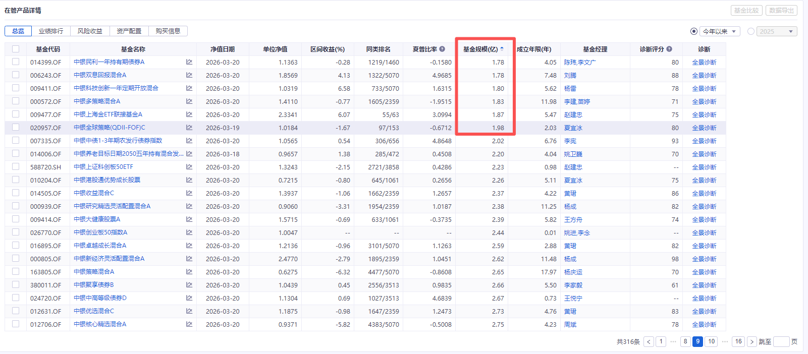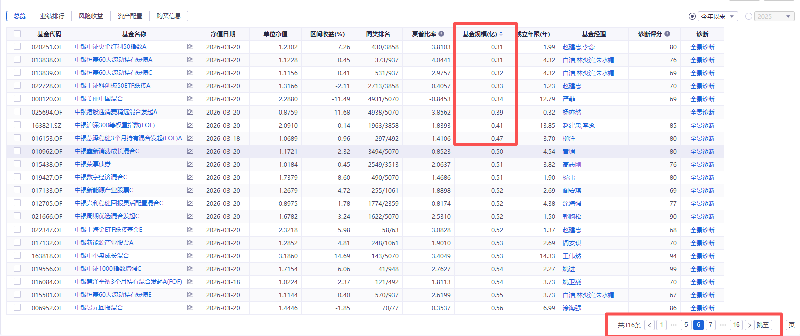 同花顺iFinD显示,截至目前,中银基金共管理316只基金(各类分开计算),其中有174只规模不足2亿元,占比超55%。