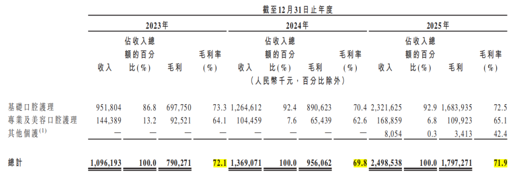2023年至2025年,小阔科技的毛利率分别为72.1%、69.8%和71.9%。招股书称,其主要牙膏产品建议零售价在9.9元至49.9元之间,而牙膏所在的基础口腔护理板块毛利率也明显领先,同期为73.1%、70.4%、72.5%。