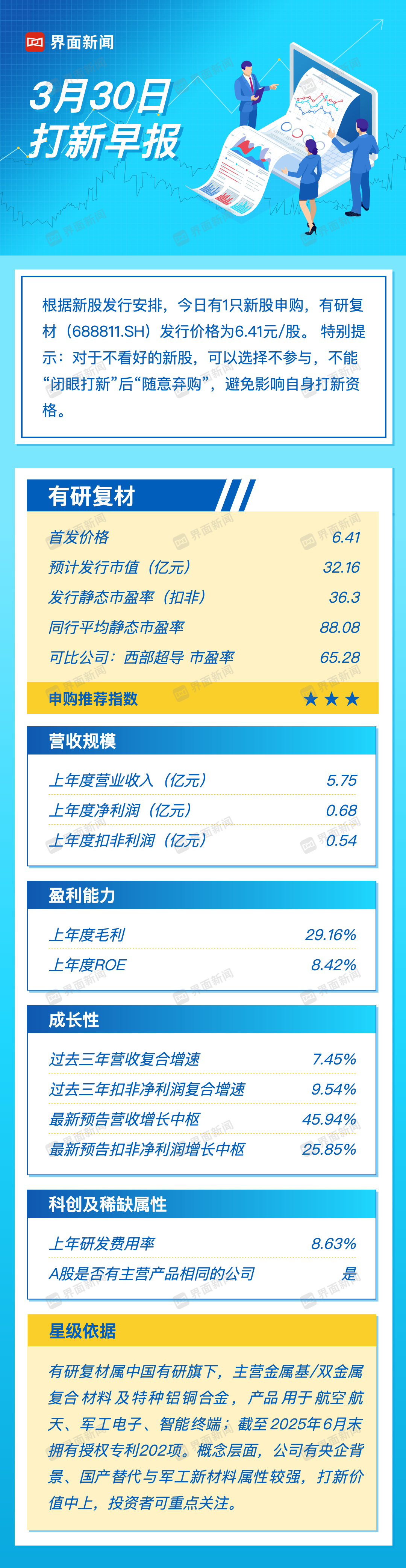 根据新股发行安排,今日有1只新股申购,有研复材(688811.SH)发行价格为6.41元/股。