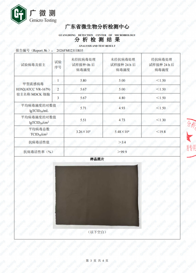 抗病毒性能:对甲型流感病毒 H3N2 抗病毒活性率>99.9%;