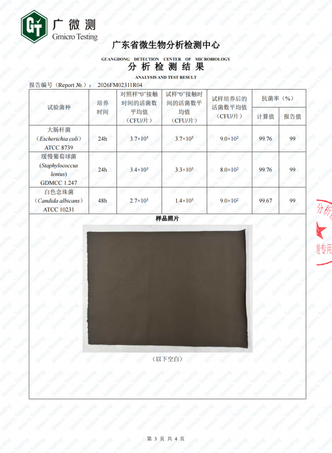 抗菌性能:对金黄色葡萄球菌、大肠杆菌抗菌率>99.99%;对缓慢葡萄球菌抗菌率 99.99%;对白色念珠菌抗菌率>99%;