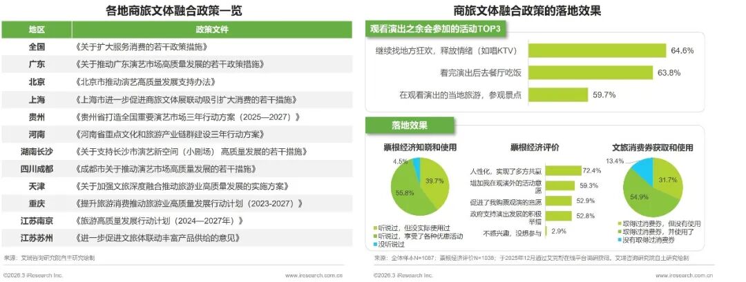 商旅文体融合,要通过机制创新、资源要素整合、产品服务共创、消费场景重构,实现商业、旅游、文化、体育各领域在空间、时间、功能、价值链上的有机联动和价值倍增。2024年至2025年,正是这一融合战略从顶层设计加速转向全面落地实施的关键窗口期,国家及地方层面密集出台了一系列政策文件,且各地在落地实行上也取得了不俗的效果。根据调研发现,票根经济和文旅消费券的使用率均超过了半数,由此证明相关政策确实让普通消费者获得了实惠,这对于进一步持续加强演出市场发展具有非常重要的意义。