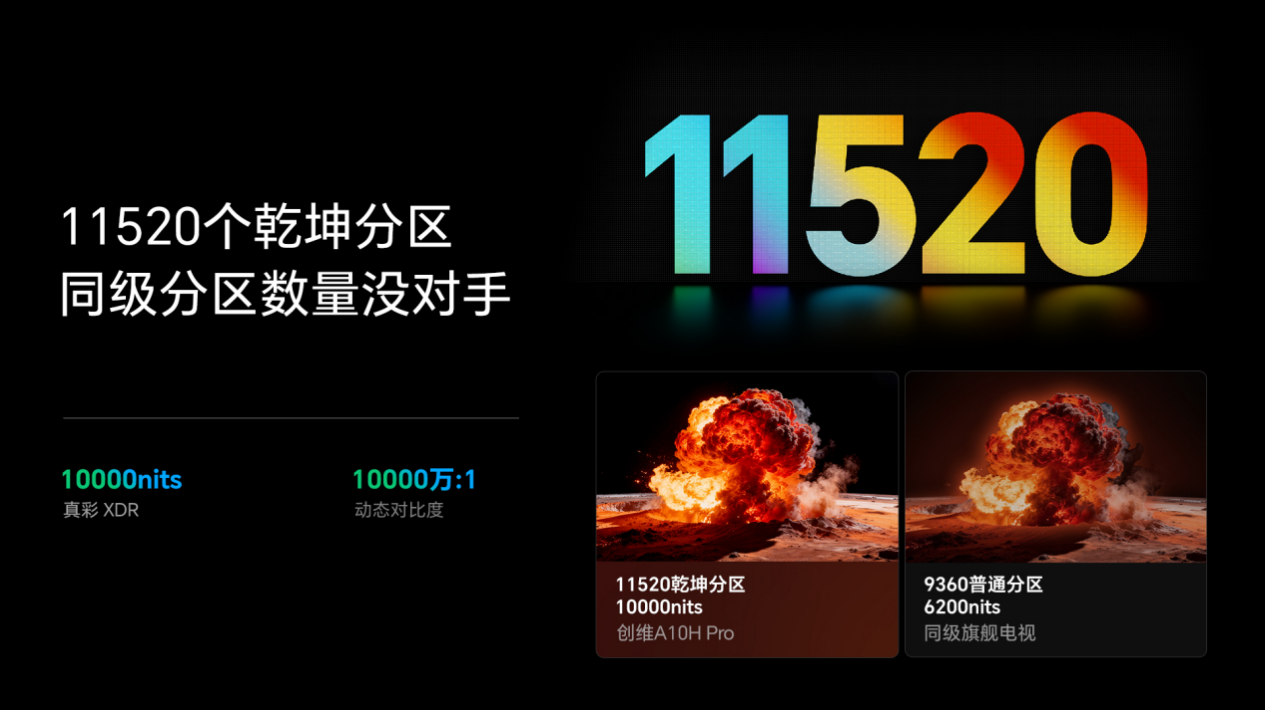 创维A10H系列不仅有让人“一眼定情”的超薄画框式设计,在画质方面也做到了旗舰级表现。创维A10H系列拥有最高11520个乾坤分区,能够精准控制不同区域背光亮度,大幅减少杂散光对显示效果的影响,让黑色不发灰、彩色更鲜艳,有效提升画面亮度、对比度及光影层次感。