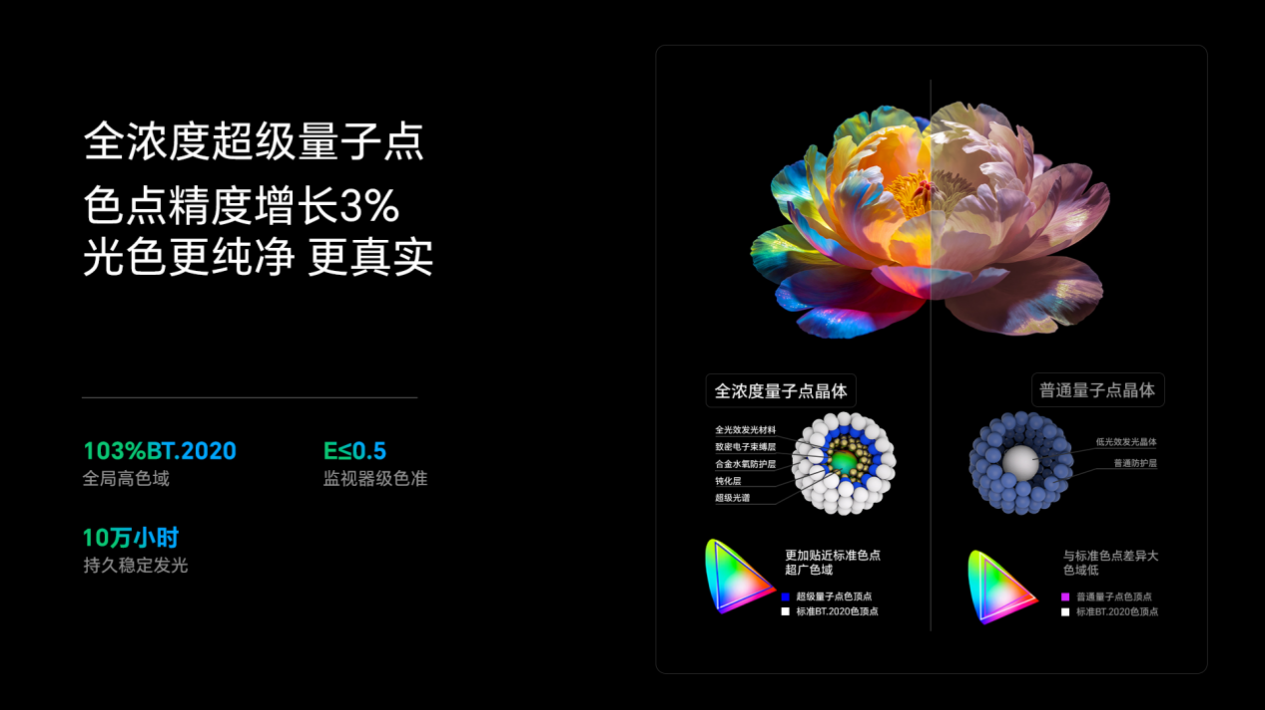 色彩方面,创维A10H Pro采用了SDQ-Pro第二代超级量子点技术,完成了局部高色域到全局更高色域的跨越式进阶,并升级了独家「1nm真彩滤光层」,色彩纯度提升47%,高达103%的BT.2020色域覆盖远超传统显示标准,整体画面色准达到了ΔE≤0.5的越级水准,为真实还原不同影片的鲜活色彩保驾护航。