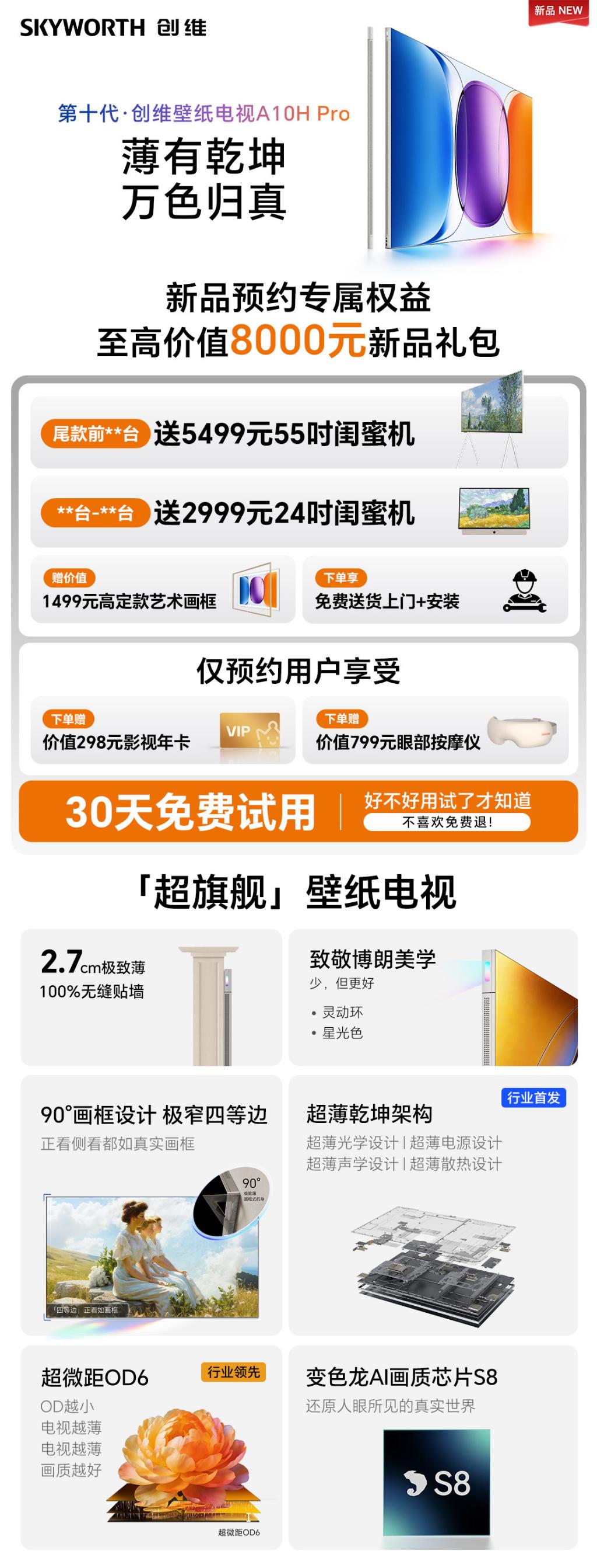 作为当之无愧的2026年超旗舰标杆,创维壁纸电视A10H系列重新定义了超高端电视的体验标准,此次预售更是福利拉满,除了创维A10H Pro专享的30天免费试用这个重磅新品权益外,还可获赠至高价值8000元的新品礼包,想要在今年给家里换台电视的朋友们,千万别错过这次预售活动!