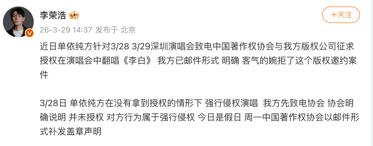 事情的起因是,3月29日下午两点半左右,李荣浩在社交平台连发多条内容,控诉单依纯在近日的深圳商业演唱会上,未经授权强行翻唱其代表作《李白》,涉嫌构成版权侵权行为。此事在社交平台引发热议。