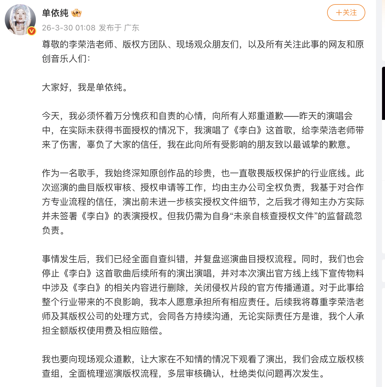 单依纯在文章称,此次巡演的曲目版权审核、授权申请等工作,均由主办公司全权负责,自己演出前未进一步核实授权文件细节,之后才得知主办方实际并未签署《李白》的表演授权,将对“未亲自核查授权文件”的监督疏忽负责。
