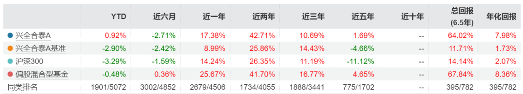 但另一只产品兴全合衡表现不及预期,该产品2022年1月中旬成立,成立4年来截至3月27日总回报-3.74%。在2518只同类产品中,排名第1110位。