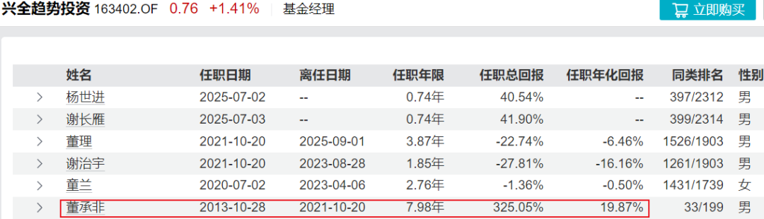 2026年1月,因个人原因,董理卸任了唯一一只管理的产品兴全轻资产混合,在此之前的2025年12月,该产品迎来共管基金经理程剑。早在2025年9月,董理卸任基金核心产品兴全趋势投资,市场就有声音称其已经萌生退意。