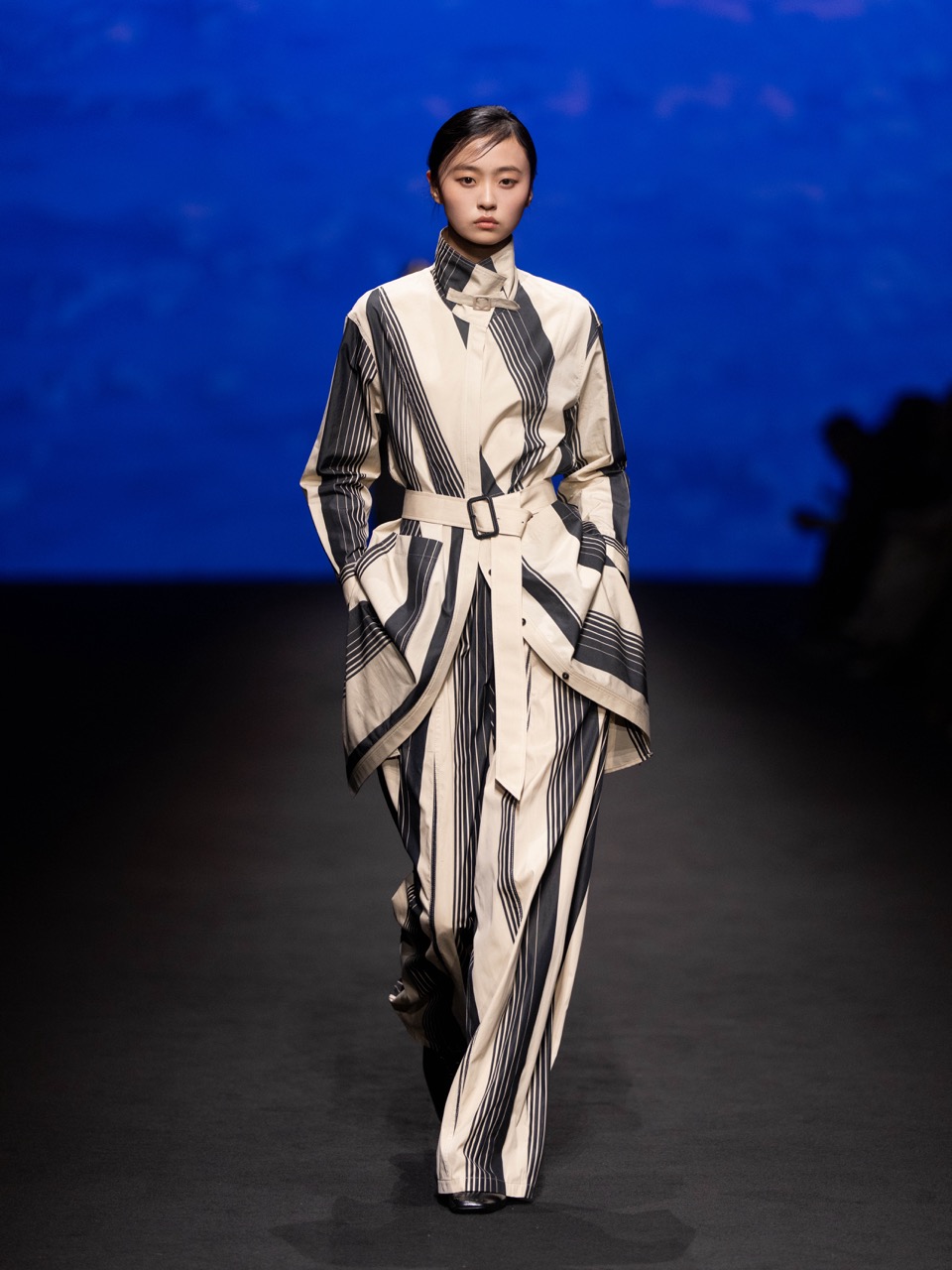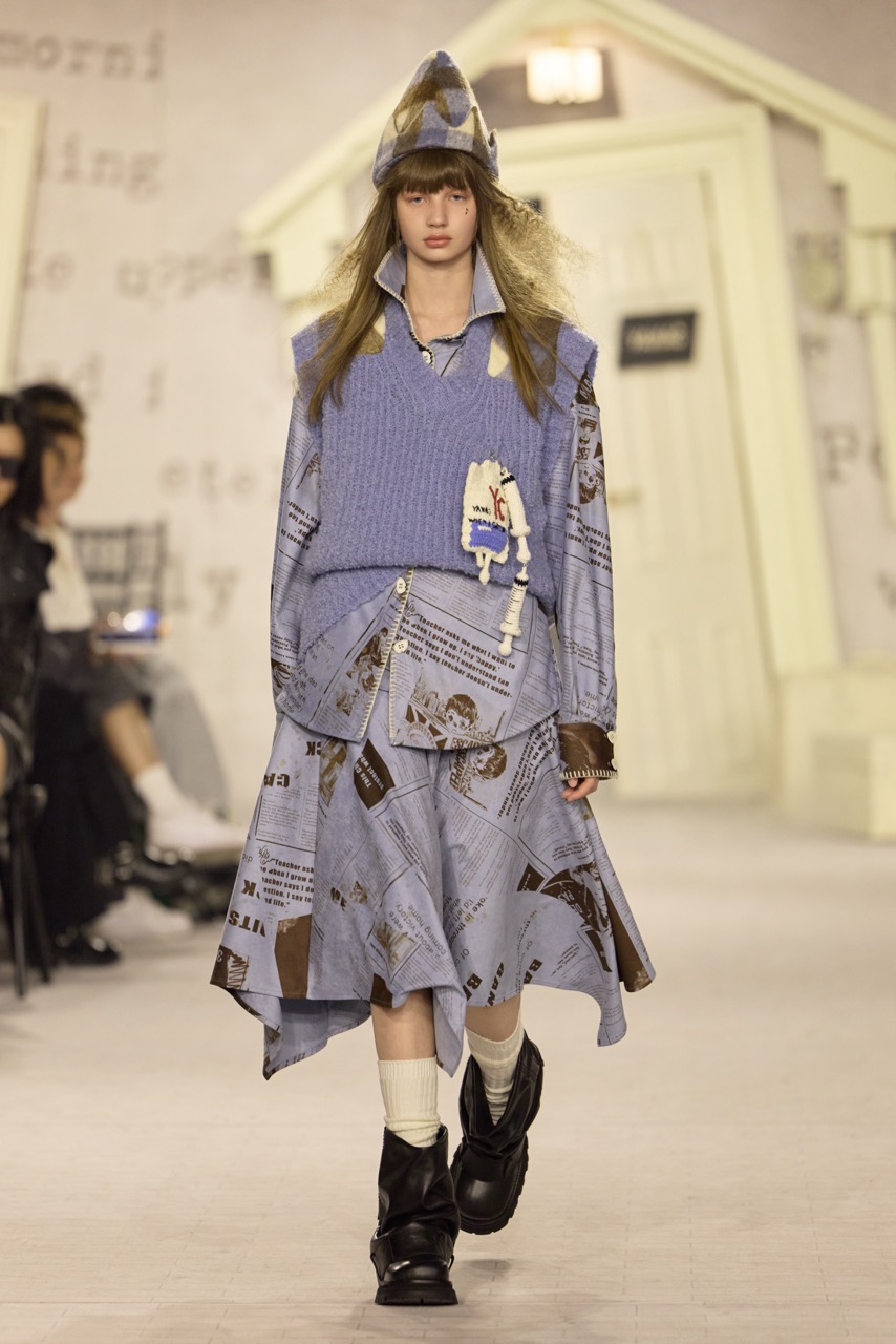 这种来自童年的自由与孤独,被转译为服装语言。柔软针织与旧化质感面料叠加,呈现出被时间磨过的触感;不对称廓形与拼接细节,则模拟孩子式的随意搭配,让造型在不规则中形成个人表达。层次结构强调包裹与保护,也回应秋冬语境下的温度感。