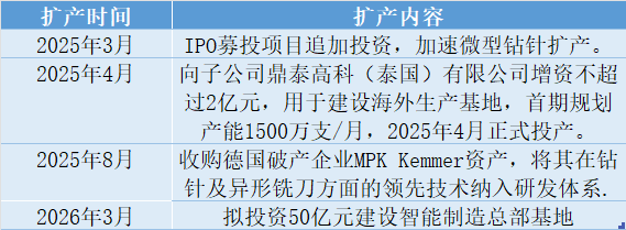 同日,公司公告称,拟在东莞投资50亿元建设智能制造总部基地,其中固定资产投资40亿元,分三期推进,聚焦微型钻针、高端工业刀具及高性能膜材料研发生产。这是公司自2022年11月上市以来的第四次扩产动作。