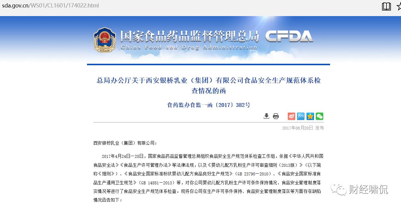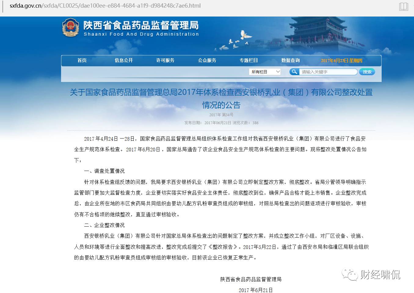 然而,《财经啸侃》特约、独家撰稿人五谷君注意到,6月21日,也就是国家食药监总局发布该函的第二天,陕西省食品药品监督管理局(下称“陕西食药监”)就发布一则公告即《关于国家食品药品监督管理总局2017年体系检查西安银桥乳业(集团)有限公司整改处置情况的公告》。