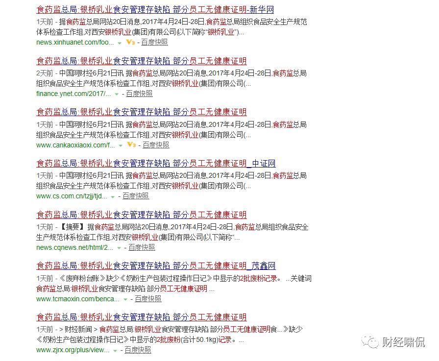 该函指出,2017年4月24日—28日,国家食药监总局组织食品安全生产规范体系检查工作组,依据有关规定,对银桥乳业婴幼儿配方乳粉生产许可条件保持情况、食品安全管理制度落实情况等进行了食品安全生产规范体系检查,经查,银桥乳业在生产许可条件保持、食品安全管理制度落实等方面存在八大缺陷,其中部分员工没有健康证明引发社会高度关注,新华网等媒体也以此为题进行报道。
