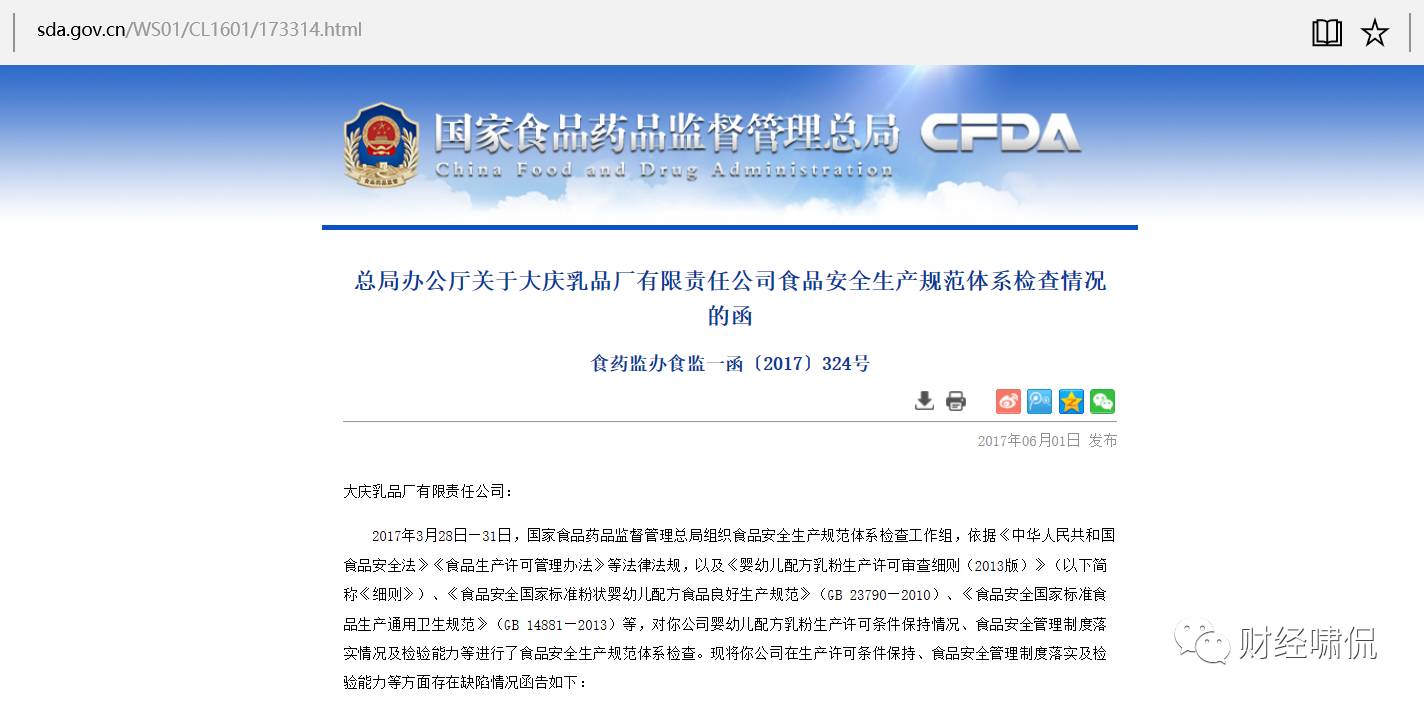 2017年5月25日,国家食药监总局也在官方网站公布了一则《关于大庆乳品厂有限责任公司食品安全生产规范体系检查情况的函》,指出大庆乳品厂在企业生产许可条件保持情况、食品安全管理制度落实情况及检验能力等方面存在缺陷。