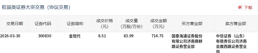3月30日,金现代大宗交易成交83.99万股,成交额714.75万元,占当日总成交额的4.06%,成交价8.51元,较市场收盘价10.76元折价20.91%。