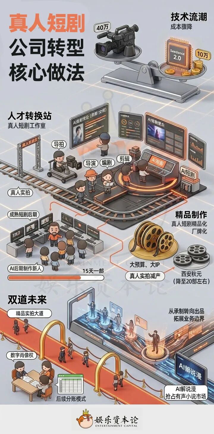 此前,小娱在真人短剧降薪大调查中提到,在技术迭代和平台政策的调整下,真人短剧减量减产,特别是走量、赚保底费的中小承制方受影响极大,不少公司已经停止真人实拍项目,选择AIl in AI。
