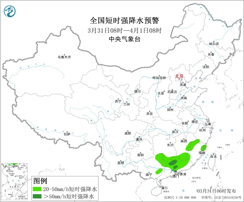中央气象台3月31日06时继续发布强对流天气黄色预警:预计3月31日08时至4月1日08时,华南、江南南部等地的部分地区将有8级以上雷暴大风或冰雹天气,其中,江西南部、广东北部等地的部分地区将有10级以上雷暴大风,最大风力可达11级以上;华南、江南东部和南部等地的部分地区将有小时雨量大于20毫米的短时强降水天气,其中,广东中北部等地的部分地区小时雨量大于50毫米,最大可达60毫米以上。