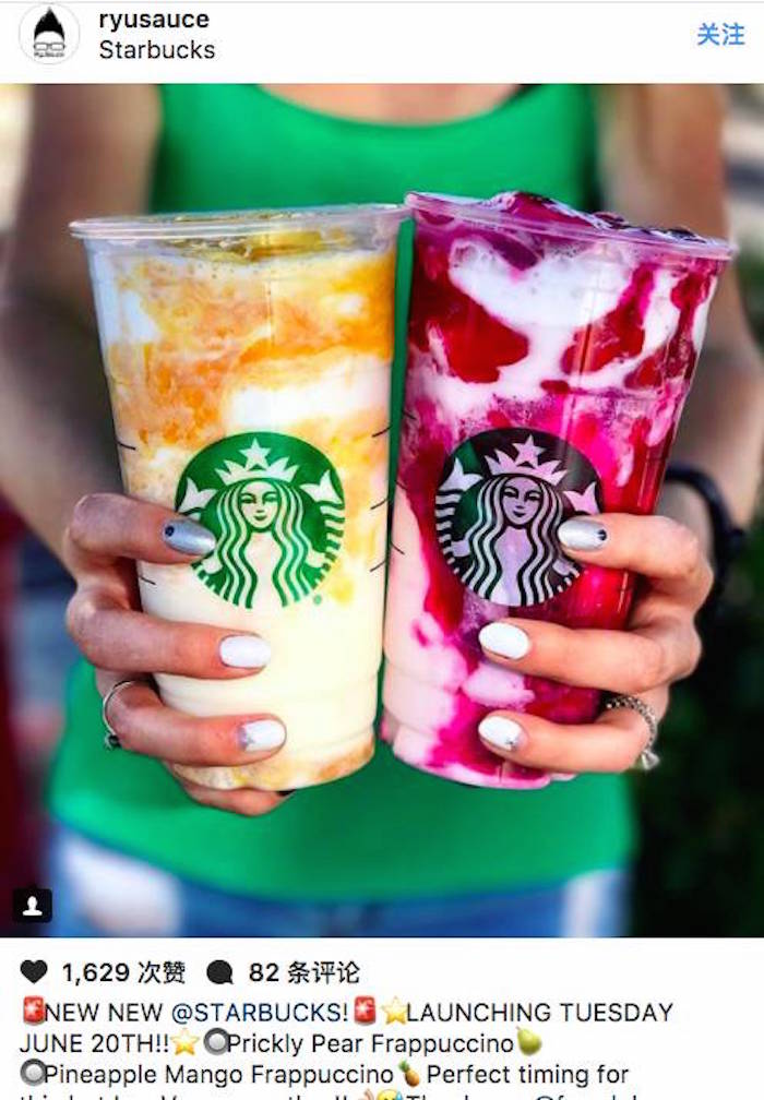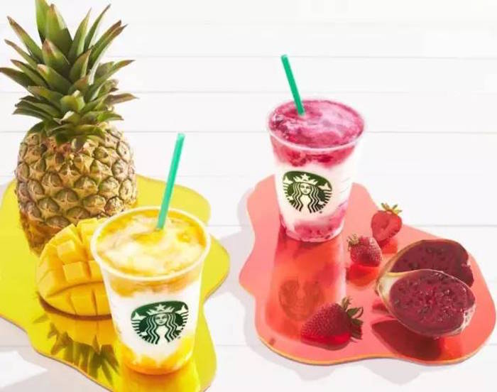 星巴克最近推出了两款夏日海滩风主题的果味星冰乐。新海报看起来完全就是芒果味和草莓味的阿尔卑斯棒棒糖融化之后的样子,口味分别是芒果配菠萝、以及草莓搭配仙人掌果。