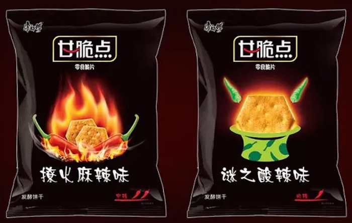 这款名为”甘脆点零食脆片”的发酵饼干目前有“撩火麻辣味”和“谜之酸辣味”两种口味。40g和90g的两种规格,售价分别为3元和6.5元。新产品的口号是“无所味惧、干脆挑战”,康师傅说,这就是年轻人的性格。