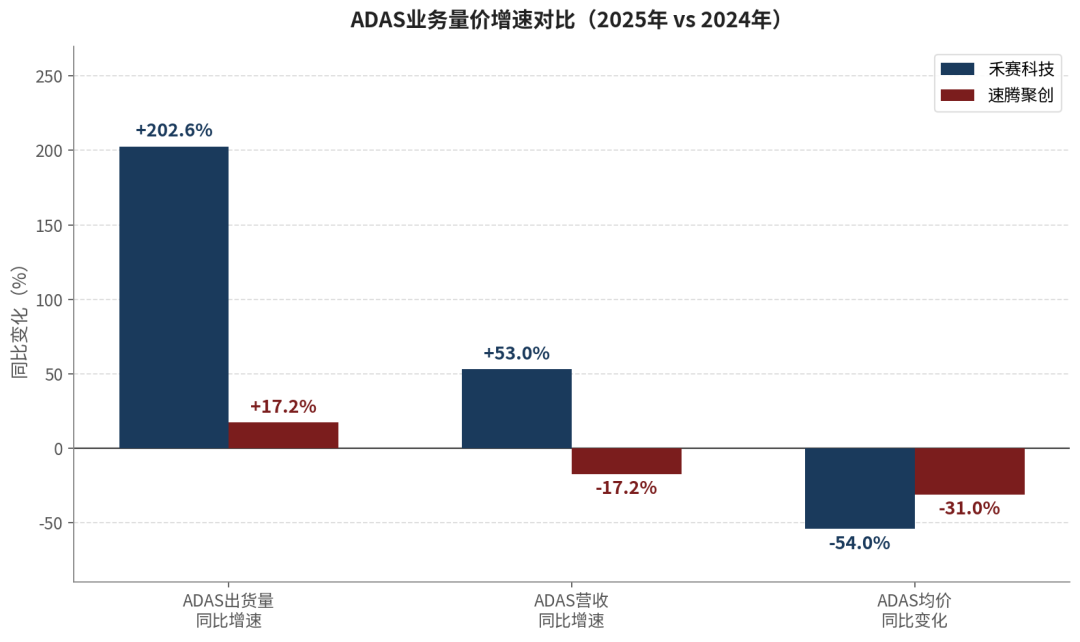 速腾2025年ADAS出货量同比增长了17.2%,达到60.9万台,但该业务的营收同比下滑了17.2%,降至11.1亿元。出货量涨了,收入反而跌了,原因是产品单价在快速下滑。速腾ADAS产品的平均单价从2024年的约2600元跌至2025年的约1800元,降幅接近三成,降价幅度超过了销量增长,导致这块业务整体萎缩。