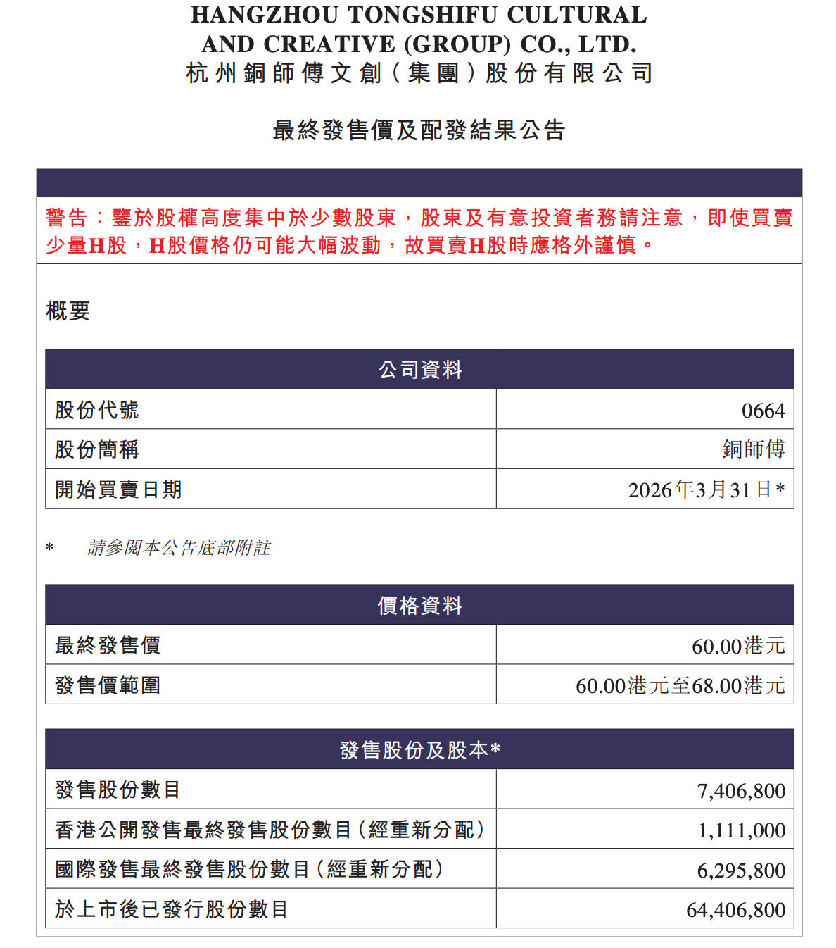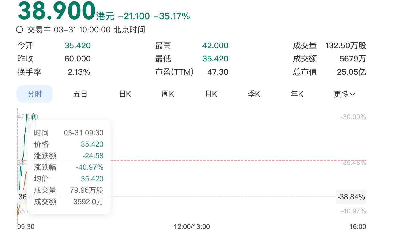 铜师傅此次全球发售共740.68万股H股,募集资金净额约3.9亿港元。尽管公开发售获得超额认购,但机构投资者相对谨慎,国际发售部分仅获1.56倍认购。3月30日的暗盘交易中,铜师傅股价已下跌超过6%,收盘跌幅更扩大至约30%。