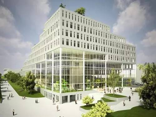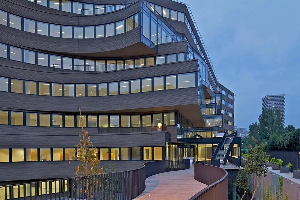 顶部台阶状的形式创造了各层间良好的穿插与连接关系,办公区域总共9层,每一层都有室外花园平台,并拥有良好的城市景观。斜面平台的模式为办公楼设计探索了一条新路,有了这些平台,楼层间的关系更加紧密,同时也为大面积绿化提供了必要条件。